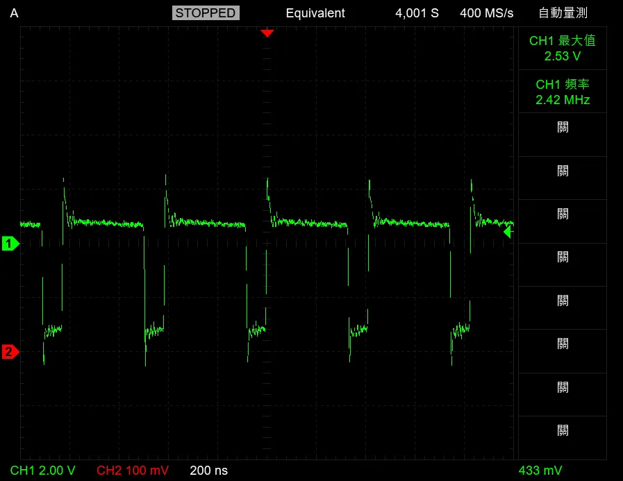 But why? I went back and carefully re-read the datasheet, cross-referencing it with my design. First, the layout. I had previously asked Gemini to read the datasheet and summarize the wiring, but in the end, I still had to read it myself. The reference circuit didn’t quite match—my input/output capacitors were a bit off, and the recommended layout was to widen the power and inductor traces. But these points shouldn’t cause a discrepancy of several hundred times, right? I also measured the waveform with my oscilloscope. Aside from some overshoot during inductor switching, the input and output were relatively stable.